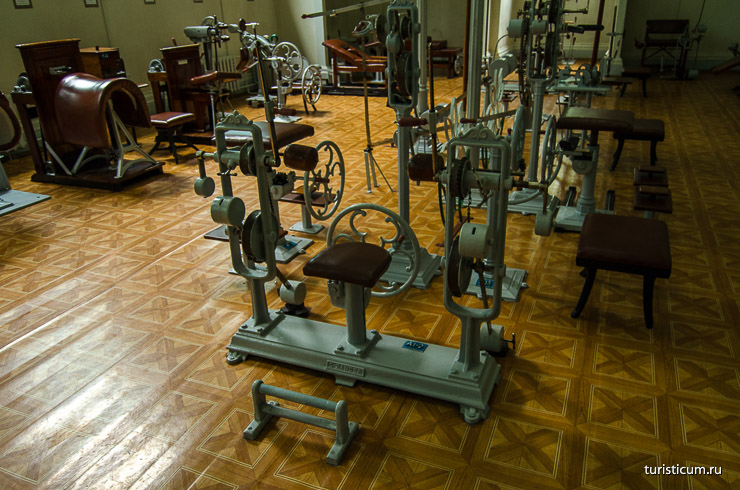 На стене зала фото вековой давности. Дамы в пышных нарядах у тренажеров. Тогда это было светским мероприятием. Возможность посплетничать, попить чаю и даже завести романы. Сюда часто захаживали завидные женихи.
